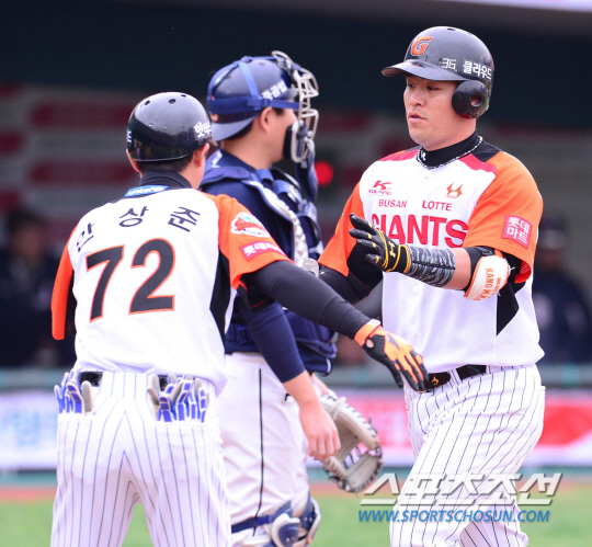 5일 오후 부산 사직야구장에서 2015 프로야구 두산과 롯데의 경기가 열렸다. 2회말 무사 1루서 롯데 강민호가 좌중월 2점 홈런을 친 후 홈에서 안상준 코치와 하이파이브를 나누고 있다. 부산=김경민 기자 kyungmin@sportschosun.com / 2015.04.05. |