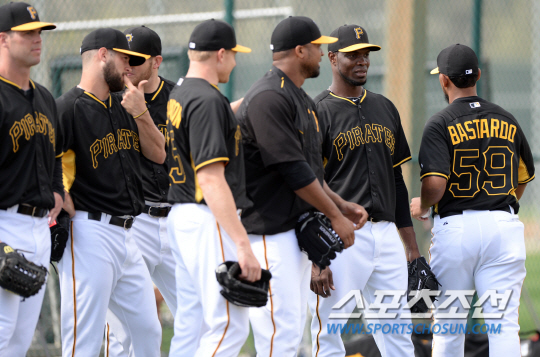 피츠버그 파이어리츠의 강정호가 27일(한국시간) 미국 플로리다 주 브래든턴의 파이어리츠 시티에서 펼쳐진 팀의 공식훈련에 참가해 구슬땀을 흘렸다. 리즈가 수비훈련을 위해 자신의 차례를 기다리고 있다. 브래든턴(미국)=허상욱 기자 wook@sportschosun.com/2015.02.27/