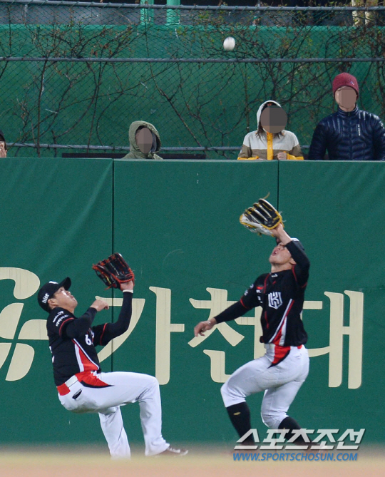 2015 KBO리그 SK와이번즈와 kt위즈의 경기가 7일 인천SK행복드림구장에서 열렸다. kt 중견수 배병옥과 우익수 김사연이 SK 3회말 2사 1루 조동화의 플라이성 타구를 놓치고 있다. 문학=최문영 기자 deer@sportschosun.com /2015.04.07/