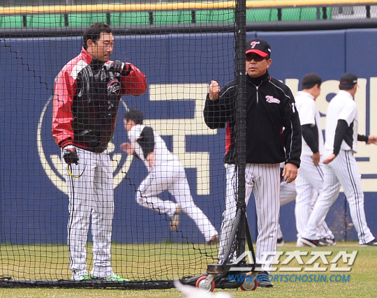 | 2015 KBO리그 LG트윈스와 삼성라이온즈의 경기가 5일 서울잠실야구장에서 열렸다. 경기전 LG 양상문 감독이 봉중근과 이야기를 나누고 있다. 잠실=최문영 기자 deer@sportschosun.com /2015.04.05/ |