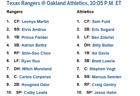 제프 배니스터 감독은 2차전 선발 타순을 레오니스 마틴(중견수)-엘비스 안드루스(유격수)-프린스 필드(1루수)-애드리안 벨트레(3루수)-추신수(우익수)-라이언 루아(좌익수)-미치 모어랜드(지명타자)-카를로스 코포란(포수)-루그네드 오도르(2루수) 순으로 구성했다.