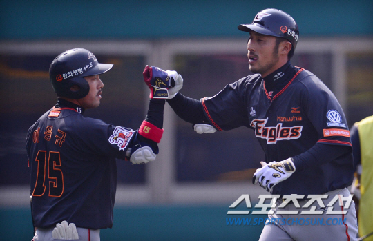 29일 오후 서울 목동야구장에서 열릴 2015 프로야구 한화와 넥센의 경기가 열렸다. 3회초 무사서 한화 김경언이 우중월 솔로홈런을 친 후 홈에서 이용규와 하이파이브를 나누고 있다. 목동=김경민 기자 kyungmin@sportschosun.com / 2015.03.29. |