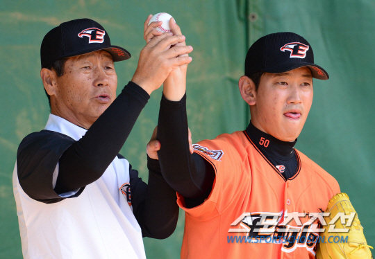 한화 이글스가 8일 1대2 트레이드로 넥센 히어로즈에 내준 우완투수 양 훈은 김성근 감독이 스프링캠프에서 공들여 성장시킨 투수다. 좋은 신체조건에 빠른 공을 지닌 양 훈을 선발과 불펜에서 모두 활용 가능하다고 봤다. 사진은 지난 2월17일 일본 오키나와 고친다 구장에서 진행된 스프링캠프 훈련 때 김 감독이 양 훈을 1대1로 지도하는 모습. 오키나와(일본)=김경민 기자 kyungmin@sportschosun.com / 2015.02.17.