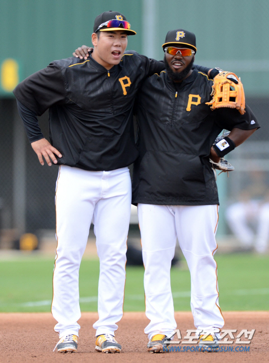 피츠버그 파이어리츠의 주전 3루수 조시 해리슨(오른쪽)과 강정호. 브래든턴(미국)=허상욱 기자 wook@sportschosun.com/2015.02.28/