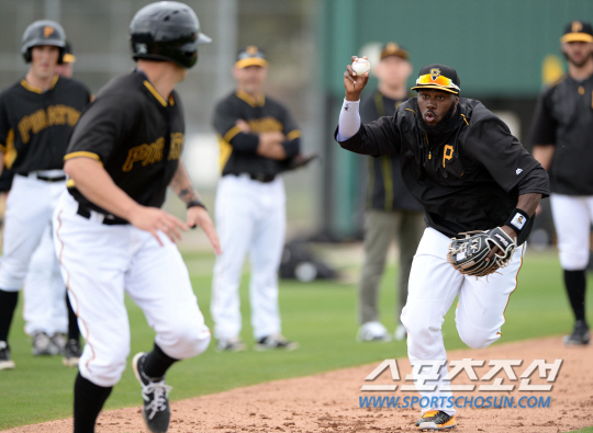 스프링캠프에서 협살플레이 훈련을 하고 있는 조시 해리슨. 브래든턴(미국)=허상욱 기자 wook@sportschosun.com/2015.02.27/