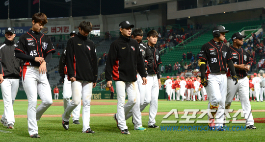 신생팀 KT가 창단 후 9연패의 늪에 빠졌다. KT위즈와 SK와이번스의 2015 프로야구 경기가 8일 인천구장에서 열렸다. 팽팽한 투수전 끝에 1-2로 패하며 KT는 시즌 시작 후 1승도 거두지 못한 채 9연패를 당했다. KT 선수들이 허탈한 표정으로 들어오고 있다. 인천=정재근 기자 cjg@sportschosun.com/2015.04.08/ |