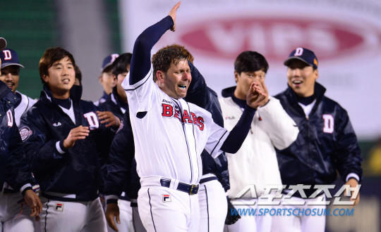 9일 오후 서울 잠실야구장에서 2015 프로야구 넥센과 두산의 경기가 열렸다. 1대0으로 승리하며 노히트노런을 달성한 두산 마야가 환호하고 있다. 잠실=김경민 기자 kyungmin@sportschosun.com / 2015.04.09.