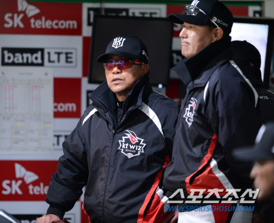 9연패를 기록중인 kt와 4연승을 달리고 있는 SK의 2015 KBO 리그 주중 3연전 마지막 경기가 9일 인천 SK행복드림구장에서 열렸다. 13대2로 뒤진 7회말 kt 조범현 감독이 경기를 지켜보며 정명원 투수코치와 이야기를 나누고 있다. 인천=허상욱 기자 wook@sportschosun.com/2015.04.09/
