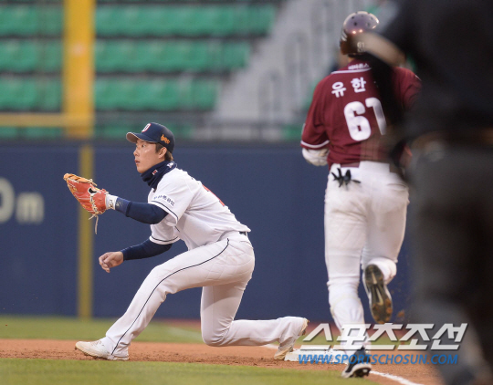 9일 오후 서울 잠실야구장에서 2015 프로야구 넥센과 두산의 경기가 열렸다. 1회초 2사서 두산 고영민이 넥센 유한준의 내야 땅볼 때 1루 수비를 하고 있다. 잠실=김경민 기자 kyungmin@sportschosun.com / 2015.04.09.