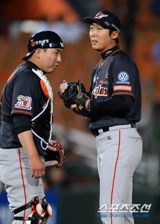 10일 부산사직구장에서 KBO리그 롯데 자이언츠와 한화 이글스의 주말 3연전 첫 번째 경기가 열렸다. 한화 배영수와 롯데 심수창이 선발 맞대결을 펼쳤다. 한화 배영수가 5회 2사 만루를 허용하고 마운드를 내려왔다. 허도환 포수와 대화를 나누고 있는 배영수. 부산=송정헌 기자 songs@sportschosun.com/2015.04.10 |
