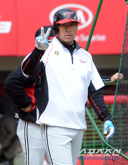 KIA와 LG의 2015 KBO 리그 개막전 경기가 28일 광주기아챔피언스필드에서 예정된 가운데 양팀 선수들이 훈련을 펼쳤다. 훈련을 하던 LG 이병규가 취재진을 보며 포즈를 취하고 있다. 광주=허상욱 기자 wook@sportschosun.com/2015.03.28/