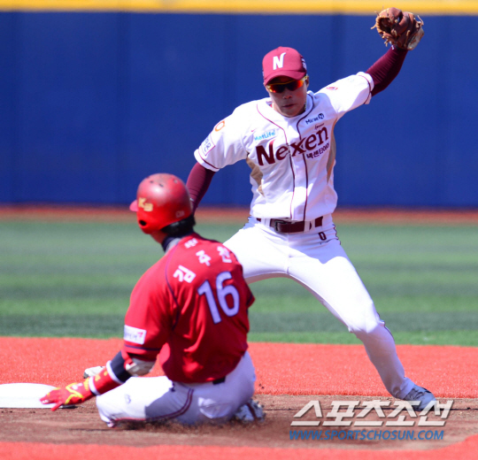 13일 오후 서울 목동야구장에서 2015 프로야구 시범경기 KIA와 넥센의 경기가 열렸다. 1회초 2사서 KIA 김주찬이 내야 땅볼을 친 후 송구가 빠진틈을 타 2루까지 뛰다 아웃되고 있다. 넥센 2루수는 넥센 김하성 목동=김경민 기자 kyungmin@sportschosun.com