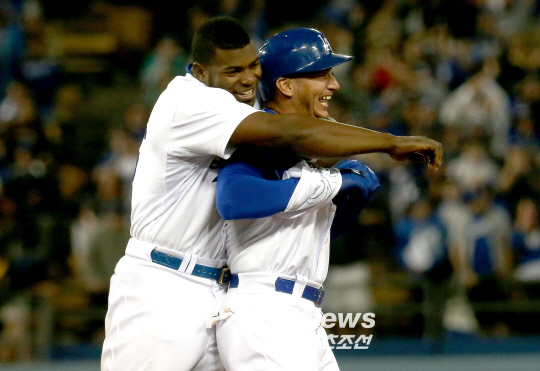 | LA 다저스 알렉스 게레로가 연장 10회 끝내기 안타를 터뜨리자 야시엘 푸이그가 뒤에 껴안고 기뻐하고 있다. ⓒAFPBBNews = News1 |