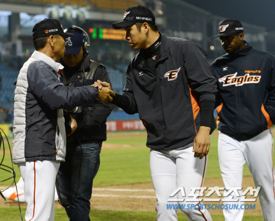 한화와 삼성의 2015 KBO리그 주중 3연전 첫번째 경기가 14일 대전 한화생명 이글스 파크에서 열렸다. 한화가 5대3으로 승리를 거뒀다. 경기 종료 후 선수들과 하이파이브를 하는 김성근 감독의 모습. 대전=허상욱 기자 wook@sportschosun.com/2015.04.14/ |