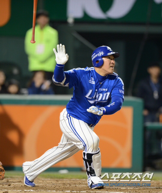 한화와 삼성의 2015 KBO리그 주중 3연전 첫번째 경기가 14일 대전 한화생명 이글스 파크에서 열렸다. 3회초 1사 1루 삼성 최형우가 한화 유먼의 투구를 받아쳐 우측담장을 넘어가는 2점홈런을 날렸다. 힘찬 스윙 후 타구를 바라보는 최형우. 대전=허상욱 기자 wook@sportschosun.com/2015.04.14/