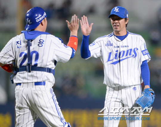 삼성 진갑용이 11일 KIA 타이거즈전서 5대2로 승리한 뒤 임창용과 하이파이브를 하고 있다. 진갑용은 15일 대전 한화전서 포수로 교체 출전해 역대 최고령 포수 출전 신기록을 세웠다. 송정헌 기자 songs@sportschosun.com