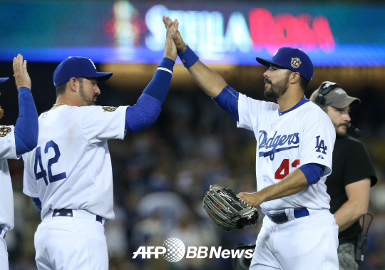 | LA다저스가 시애틀 매리너스와의 주중 홈 3연전을 스윕했다. 16일(한국시각) LA 다저스타디움에서 시애틀을 5대2로 이긴 뒤 안드레 이디어(오른쪽)와 애드리안 곤잘레스가 하이파이브를 나누며 승리를 자축하는 모습. ⓒAFPBBNews = News1 |