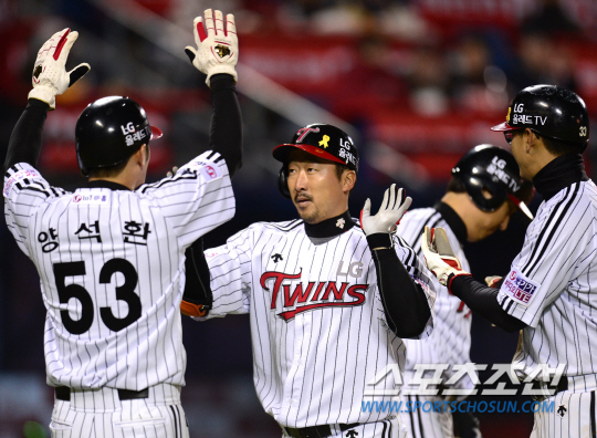 KIA 타이거즈와 LG 트윈스의 2015 프로야구 경기가 16일 잠실구장에서 열렸다. 7회말 1사 1, 2루 LG 이병규가 좌월 스리런 홈런을 치고 들어오며 축하를 받고 있다. 잠실=정재근 기자 cjg@sportschosun.com/2015.04.16/