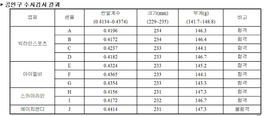 KBO(총재 구본능)의 공인구 수시검사 결과 한 개 업체 제품이 불합격 판정을 받았다.
