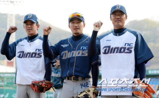 NC는 2013년 4월 18일 넥센과의 2대3 트레이드로 즉시전력감인 지석훈과 박정준을 데려왔다. 둘은 시즌 초반 NC의 내외야 구멍을 메우고 팀의 상승세를 이끌었다. 트레이드 후 선수단에 합류해 포즈를 취한 박정준, 지석훈, 이창섭(왼쪽부터). 허상욱 기자 wook@sportschosun.com/2013.04.18/