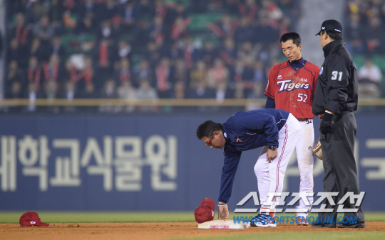 2015 KBO리그 LG트윈스와 KIA타이거즈의 경기가 15일 잠실야구장에 열렸다. LG 7회말 무사 1루 양석환 타석때 1루 대주자 문선재가 2루 도루중 세이프 판정을 받자 KIA 김기태 감독이 주자가 3피트 라인을 벗어났다며 항의하고 있다. 잠실=최문영 기자 deer@sportschosun.com /2015.04.15/