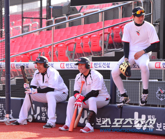 21일 오후 수원 KT위즈파크에서 열릴 2015 프로야구 SK와 KT의 경기에 앞서 KT 윤요섭(왼쪽부터), 박용근, 이대형이 이야기를 나누고 있다. 수원=김경민 기자 kyungmin@sportschosun.com / 2015.04.21.