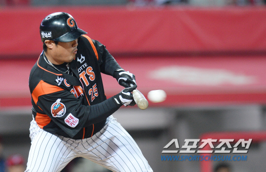 | 2015 KBO리그 KIA타이거즈와 롯데자이언츠의 21일 광주KIA챔피언스필드에서 열렸다. 롯데 6회초 무사 1,2루에서 최준석이 보내기 번트를 성공시키고 있다.광주=최문영 기자 deer@sportschosun.com /2015.04.21/ |