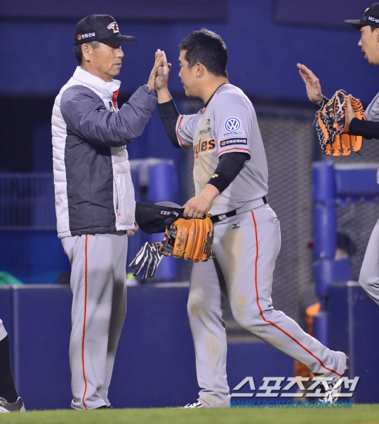 김성근 감독은 정범모를 칭찬했다. 선수는 감독의 재 기용에 감사를 드렸다. 김 감독은 LG전 승리로 두 가지를 모두 취했다.