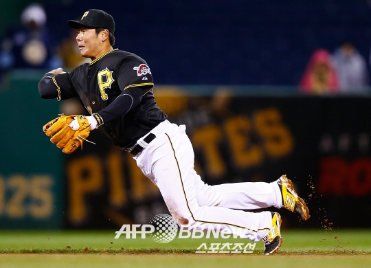 8회초 강정호가 2루 대신 3루를 선택하면서 동점을 막은 호수비 장면. 앞으로 넘어지면서도 방향을 전환해 선행주자를 잡는 현명한 선택을 했다. ⓒAFPBBNews = News1