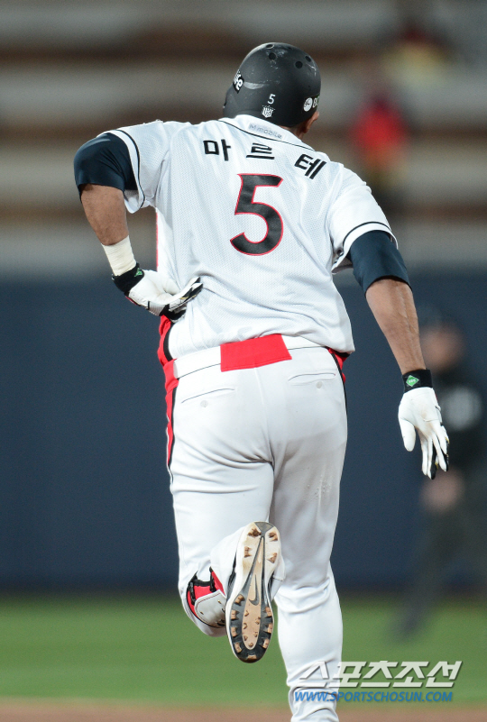 kt 위즈의 외국인 타자 마르테가 2루타를 치고 통증을 호소하며 교체됐다.