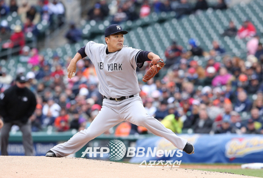 뉴욕 양키스 일본인 투수 다나카 마사히로가 24일(한국시각) 디트로이트 타이거스전에서 힘차게 공을 던지고 있다. ⓒAFPBBNews = News1 |