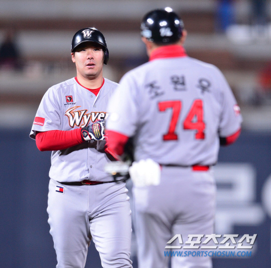 21일 오후 수원 KT위즈파크에서 2015 프로야구 SK와 KT의 경기가 열렸다. 6회초 2사 만루서 SK 이재원이 3타점 적시타를 친 후 조원우 코치와 주먹을 맞추고 있다. 수원=김경민 기자 kyungmin@sportschosun.com / 2015.04.21.