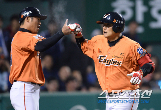 2015 KBO리그 한화이글스와 SK와이번즈의 경기가 24일 대전 한화생명 이글스파크에서 열렸다. 한화 4회말 1사후 김태균이 좌월 솔로홈런을 치고 최진행의 환영을 받고 있다. 대전=최문영 기자 deer@sportschosun.com