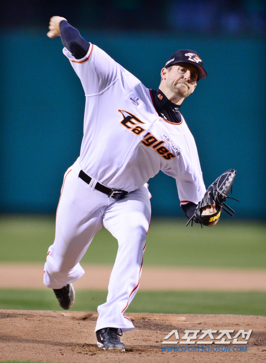 한화 이글스 탈보트가 햄스트링 부상으로 당분간 등판을 하지 못한다. 2일 오후 대전 한화생명 이글스 파크에서 2015 프로야구 두산과 한화의 경기가 열렸다. 한화 선발투수 탈보트가 두산 타자들을 상대로 힘차게 볼을 던지고 있다. 대전=김경민 기자 kyungmin@sportschosun.com