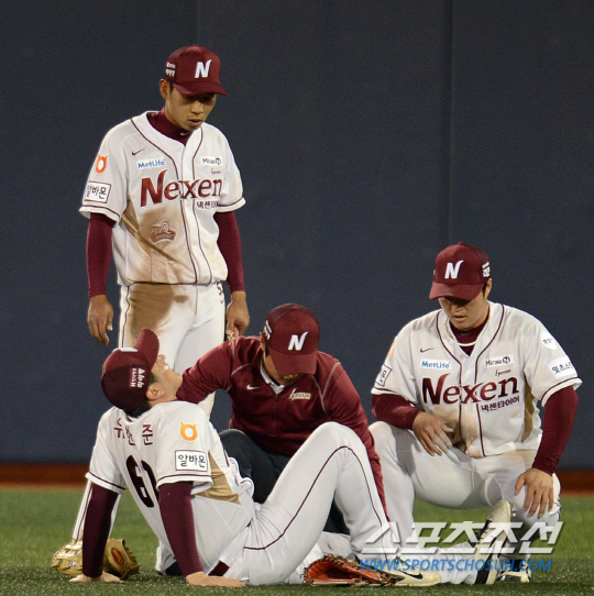 두산 베어스와 넥센 히어로즈의 2015 프로야구 경기가 21일 목동구장에서 열렸다. 3회초 1사 1, 2루 두산 김현수의 플라이를 잡다 부상을 당한 넥센 중견수 유한준이 고통스러워하고 있다. 목동=정재근 기자 cjg@sportschosun.com/2015.04.21/ |