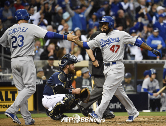 메이저리그 LA다저스의 하위 켄트릭(오른쪽)이 26일(한국시각) 미국 샌디에고 펫코파크에서 열린 샌디에고 파드리스와의 원정경기에서 5회 2점 홈런을 치고 홈에 들어오면서 팀 동료 애드리안 곤잘레스와 하이파이브를 나누고 있다. ⓒAFPBBNews = News1