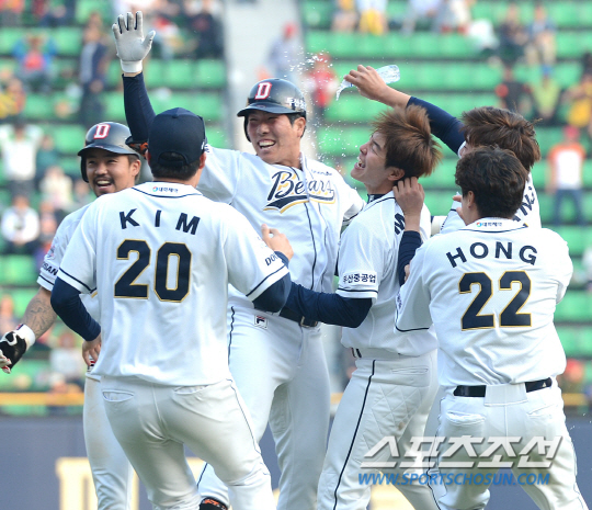 ◇KIA 타이거즈와 두산 베어스의 2015 프로야구 경기가 26일 잠실구장에서 열렸다. 12회말 1사 2, 3루 두산 유민상의 중견수 플라이 때 3루주자 정진호가 홈인하며 끝내기 승리를 거뒀다. 끝내기 희생타를 친 유민상의 동료들의 축하를 받고 있다. 잠실=정재근 기자 cjg@sportschosun.com/2015.04.26/ |