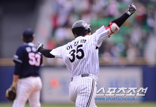 12일 오후 서울 잠실야구장에서 2015 프로야구 두산과 LG의 경기가 열렸다. 9회말 무사 1루서 LG 이진영이 우월 끝내기 2점 홈런을 친 후 환호하며 1루로 뛰어나가고 있다. 잠실=김경민 기자 kyungmin@sportschosun.com / 2015.04.12.