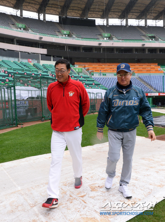 29일 문학SK행복드림구장에서 열릴예정인 SK와이번스와 NC다이노스의 경기는 우천으로 취소되었다. SK 김용희 감독과 NC 김경문 감독이 비오는 그라운드를 걸으며 이야기를 나누고 있다. 인천=최문영 기자 deer@sportschosun.com /2015.04.29/