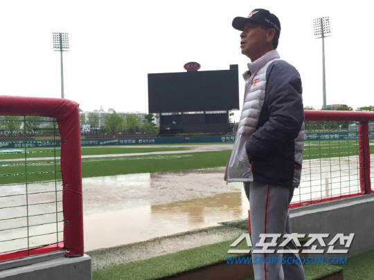 ◇한화 이글스 김성근 감독이 28일 광주 기아 챔피언스필드에서 열릴 예정이던 KIA 타이거즈와의 경기가 우천 취소된 뒤 덕아웃에 나와 비내리는 그라운드를 바라보고 있다. 광주=이원만 기자wman@sportschosun.com