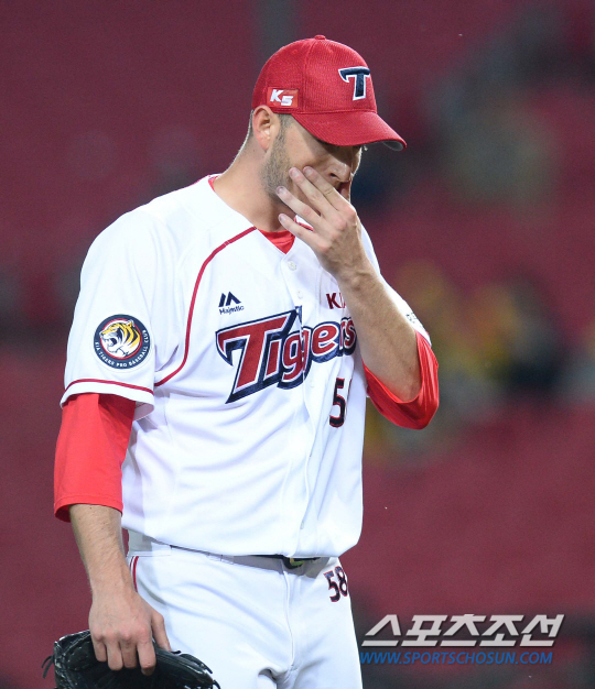| 29일 오후 광주 기아챔피언스필드에서 2015 프로야구 한화와 KIA의 경기가 열렸다. 5회초 1사서 한화 김회성에게 좌중월 솔로홈런을 허용한 KIA 험버가 아쉬워하고 있다.광주=김경민 기자 kyungmin@sportschosun.com / 2015.04.29. |