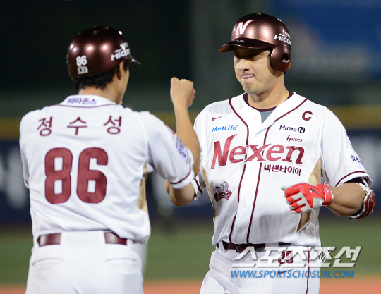 롯데와 넥센이 올시즌 첫 맞대결을 펼친다. 롯데 자이언츠와 넥센 히어로즈의 2015 프로야구 경기가 28일 목동구장에서 열렸다. 7회말 1사 넥센 이택근이 대타로 나와 우전 안타를 치고 1루코치의 축하를 받고 있다. 목동=정재근 기자 cjg@sportschosun.com