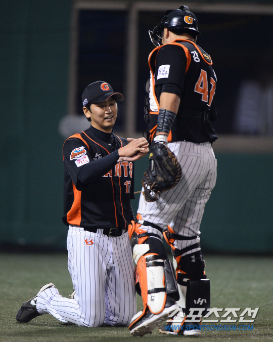 30일 서울 목동구장에서 KBO리그 넥센과 롯데의 경기가 열렸다. 넥센 8회 2사 2루에서 김하성의 안타 때 2루주자 윤석민이 홈에서 태그 아웃 됐다. 실점 위기를 넘긴 후 강민호 포수가 심수창과 악수를 나누고 있다. 목동=송정헌 기자 songs@sportschosun.com/2015.04.30