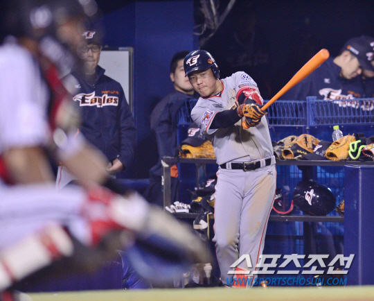 22일 오후 서울 잠실야구장에서 2015 프로야구 한화와 LG 경기가 열렸다. 6회초 한화 정근우가 덕아웃에서 타격 연습을 하고 있다. 잠실=김경민 기자 kyungmin@sportschosun.com