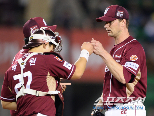 2일 잠실구장에서 KBO리그 LG 트윈스와 넥센 히어로즈의 주말 3연전 두 번째 경기가 열렸다. 선발로 등판한 넥센 밴헤켄이 7과 2/3이닝 1실점 호투를 펼쳤다. 8회 마운드를 내려오기 전 박동원 포수와 하이파이브를 나누고 있는 밴헤켄. 잠실=송정헌 기자 songs@sportschosun.com/2015.05.02