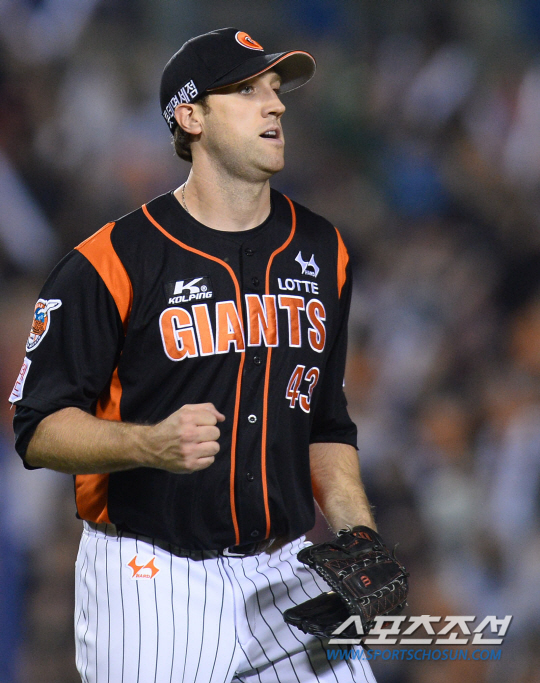 2015 KBO리그 두산베어스와 롯데자이언츠의 경기가 18일 서울잠실야구장에서 열렸다. 롯데 선발투스 린드블럼이 8회말 2사후 허경민을 땅볼처리하며 주먹을 불끈 쥐고있다. 잠실=최문영 기자 deer@sportschosun.com