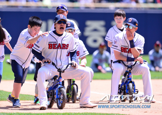 5일 오후 서울 잠실야구장에서 2015 프로야구 LG와 두산의 경기가 열렸다. 어린이날 이벤트로 열린 릴레이 경기에서 두산 민병헌이 즐거운 시간을 보내고 있다.잠실=김경민 기자 kyungmin@sportschosun.com