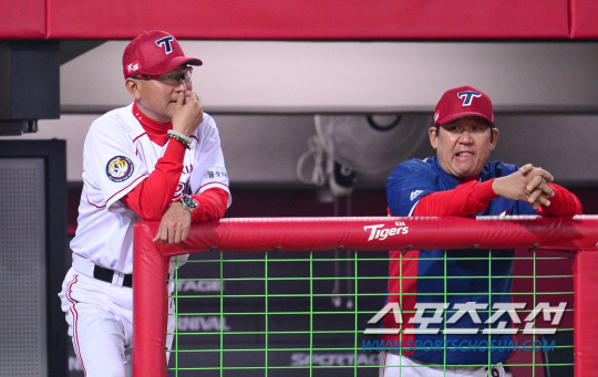 30일 오후 광주 기아챔피언스필드에서 2015 프로야구 한화와 KIA의 경기가 열렸다. KIA 김기태 감독이 조계현 코치와 경기를 지켜보고 있다. 광주=김경민 기자 kyungmin@sportschosun.com / 2015.04.30.