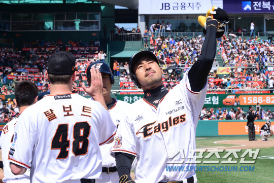 한화 이글스의 성적이 부진할 때, 대전의 외로운 스타는 김태균이었다. 타석에 들어서면 간판타자 김태균이 팬들로부터 가장 큰 박수를 받았다. FA로 영입된 정근우와 이용규가 지난해부터 그 환호성을 나눠 가진 정도. 하지만 올해는 다르다. 이 선수가 나올 때 팬들이 가장 열광한다. '김치로' 김경언이다. 믿기 힘든 맹타 행진이다. 5일 kt 위즈전도 그랬다. 1회초 상대 김상현에게 선제 스리런 홈런을 맞아 어린이날 이글스파크 분위기에 찬물이 끼얹어졌다. 그런데 1회말 김경언이 개인통산 1000경기 출전 기록 달성으로 박수를 받으며 타석에 들어서더니, 그 박수에 보답이라도 하는 듯 동점 스리런포를 때려냈다. 3안타 4타점 경기. 이번 시즌 28경기 전경기에 출전해 중심타선에서 타율 3할6푼5리 5홈런 23타점을 기록하고 있다. 이번 시즌을 앞두고 FA 대박 행진이 이어지는 가운데 3년 8억5000만원의 헐값(?)에 FA 계약을 맺었기에 팬들은 그를 'FA 모범생'이라 부른다.
