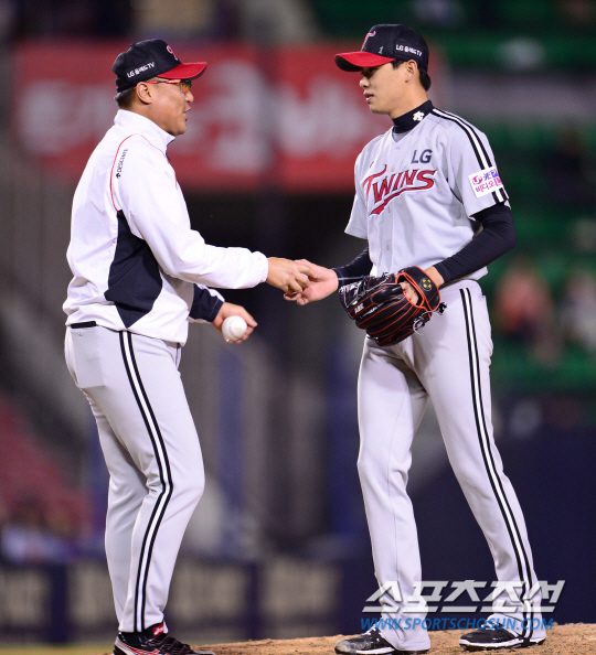 6일 오후 서울 잠실야구장에서 2015 프로야구 LG와 두산의 경기가 열렸다. 5회말 2사 1,3루서 LG 임정우가 마운드에 오른 강상수 코치와 이야기를 나누고 있다. 잠실=김경민 기자 kyungmin@sportschosun.com / 2015.05.06.